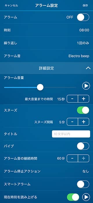 スマートアラームのON/OFFを設定します。アラームリストの[Smart Alarm]の文字をタップしてもON/OFFが切り替えられます。スマートアラームの詳細はこちらをご覧ください。