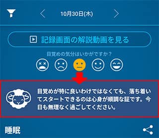 熟睡アラームが計測した睡眠時間・入眠までの時間・途中覚醒の回数などのデータ、さらにユーザーが記録する「目覚めの気分」をもとに、その日のコンディションに合わせたメッセージをお届けする機能です。