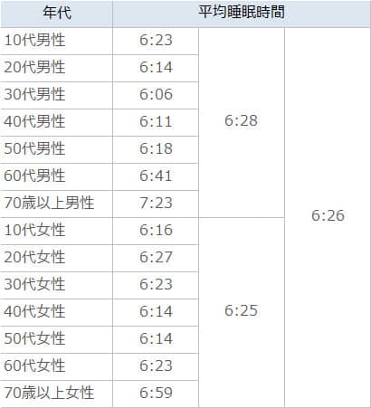今回の統計では、男女全年代の平均睡眠時間は6時間26分でした。