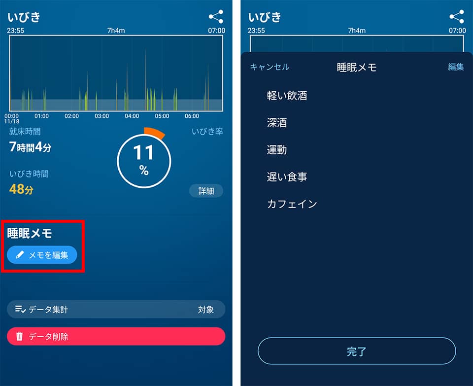 熟睡アラームでは、睡眠を計測するだけでなく、「なぜ眠れなかったのか」「どんなときに調子がいいのか」といった“眠りの原因”を探るためのヒントを残せる機能があります。