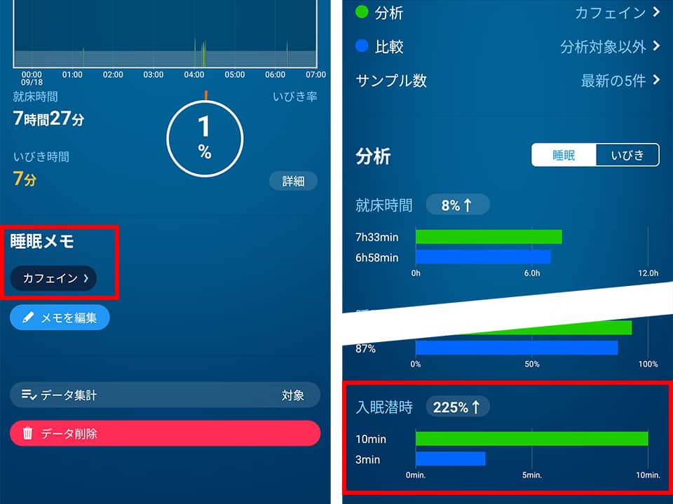- 記録画面の「カフェイン」をタップし、睡眠メモ分析画面でそれぞれの日の「入眠までの時間(入眠潜時)」を比べてみると…