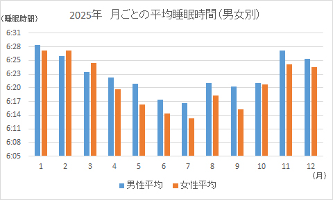 2025年の夏は観測史上最も暑い夏となって平年を2℃以上上回り、特に東日本などで記録的な猛暑が続きました。その影響か、季節の変わり目である6月から7月にかけての睡眠不足が顕著であり、1月との平均睡眠時間の差は10分を超えています。