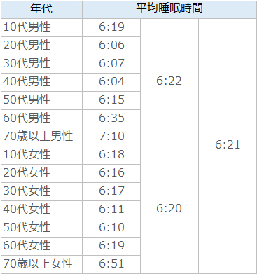 この表では男性で20~40代、女性で40~50代の睡眠不足が顕著に見られます。通常、成長に伴い必要な睡眠時間が減り、10代前半で約8時間、20代で約7時間程度、以降は少しずつ時間が短くなりますが、男女ともに70代を除くすべての世代で必要睡眠時間を大きく下回っていることが分かります。