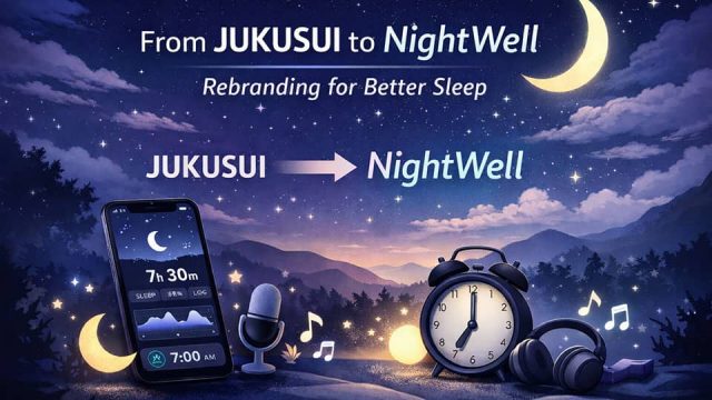 このたび海外市場向けに、アプリ名を JUKUSUI:Sleep log, Alarm clock」から「NightWell:Smart Sleep Tracker」へ変更します。
