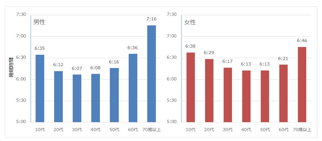 年代別にみると、男性は30代、女性は40代、50代の平均睡眠時間が一番短い結果になりました。