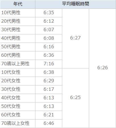 今回の統計では、男女全年代の平均睡眠時間は6時間26分でした。